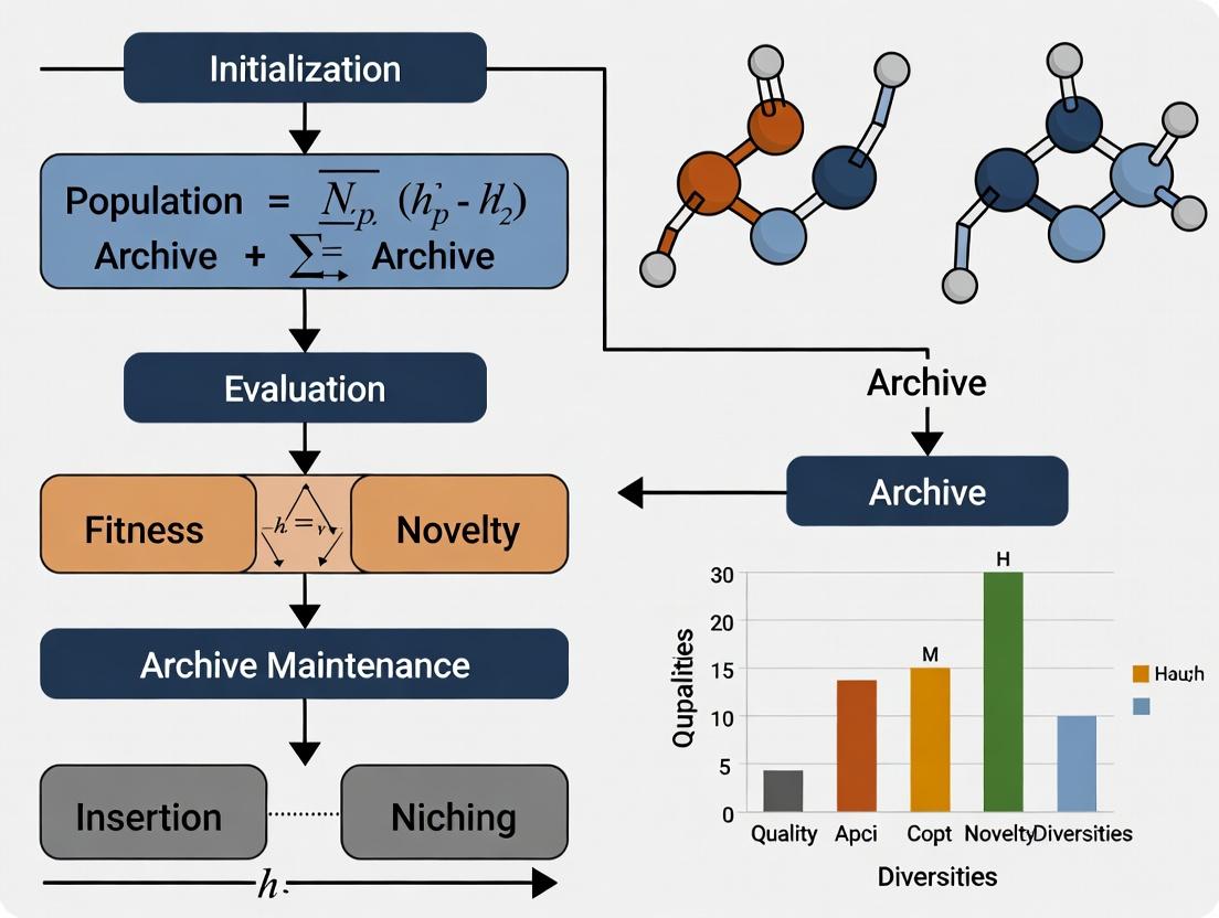 Traditional EAs apply fixed genetic operators (crossover, mutation) and selection mechanisms. However, no single EA configuration is optimal across diverse drug discovery problem domains, such as de novo molecular design, ADMET prediction, and binding affinity optimization. Meta-optimization treats the design of an EA (e.g., choice of operators, their rates, population dynamics) as an optimization problem itself. The MAP-Elites QD algorithm is proposed as a meta-optimizer to populate a map of high-performing yet behaviorally diverse EA designs.