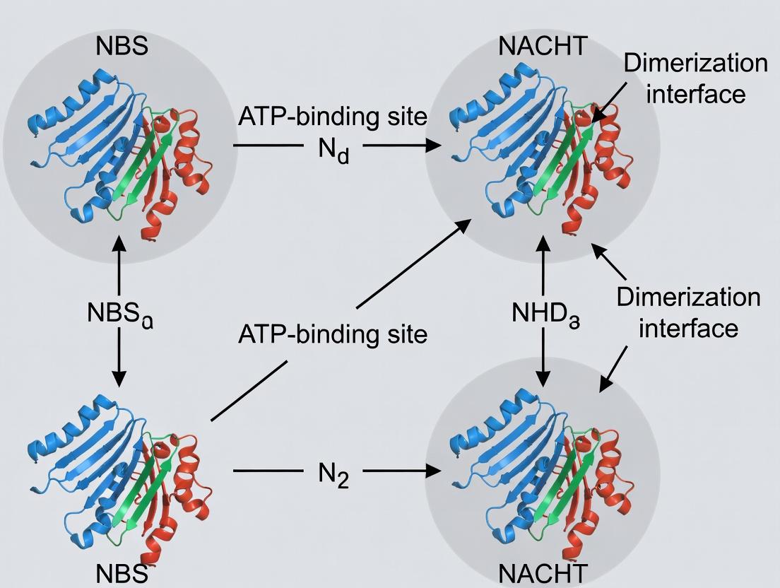 The NBS (Nucleotide-Binding Site) and NACHT domains are central to the function of innate immune sensors and cell death regulators. The nomenclature reflects a history of independent discovery and subsequent reconciliation. The NBS domain is a broad structural classification describing a conserved fold that binds ATP or GTP, frequently associated with a downstream superfamily-specific domain (e.g., LRR, WD40). The NACHT domain is a specific subclass of the NBS domain, found exclusively in animal NLR (NOD-like receptor) proteins. The name NACHT is an acronym derived from NAIP (NLR family Apoptosis Inhibitory Protein), C2TA (Class 2 transcription activator), HET-E (incompatibility locus protein from Podospora anserina), and TP1 (Telomerase-associated protein 1).