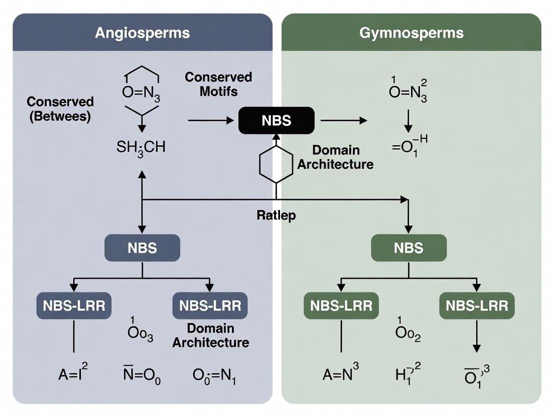 The separation of angiosperms and gymnosperms represents a major cladogenic event in plant evolution, driven by key innovations in reproductive biology, vegetative anatomy, and molecular genetics. The NBS-LRR gene family, central to innate immune signaling, has undergone distinct evolutionary trajectories in these lineages, reflecting different adaptive pressures.